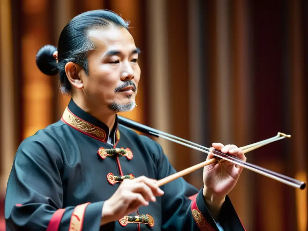 Un músico experto toca el erhu, expresando la historia y sonido del erhu a través de sus manos hábiles y emotivas