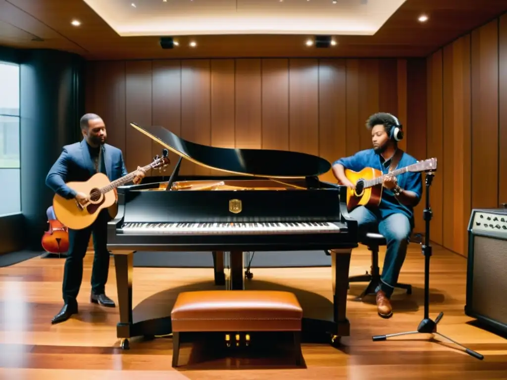 Un grupo diverso de músicos y artistas colaborando en un estudio, rodeados de instrumentos musicales y equipo de grabación
